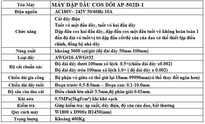 Mọi người cũng có thể tham khảo qua các thông số chi tiết của chiếc máy cắt tuốt dập đầu cos dây điện này bên dưới nhé: