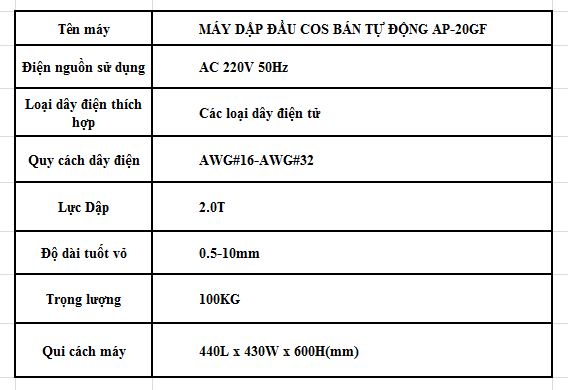 Chiếc máy dập đầu cos dây điện bán tự động AP – 20 GF này là một sự lựa không thể bỏ qua nếu mọi người đang muốn nhắm đến 1 chiếc máy dập đầu dây điện chất lượng và hiệu quả.